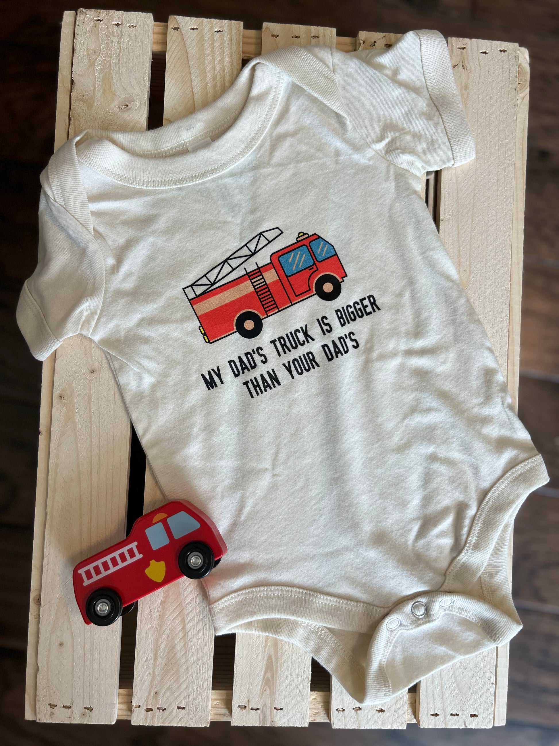 Featuring a bold red fire truck and the phrase "My Dad's Truck is Bigger Than Your Dad's," this soft, comfortable tee is perfect for the sons and daughters of everyday heroes.